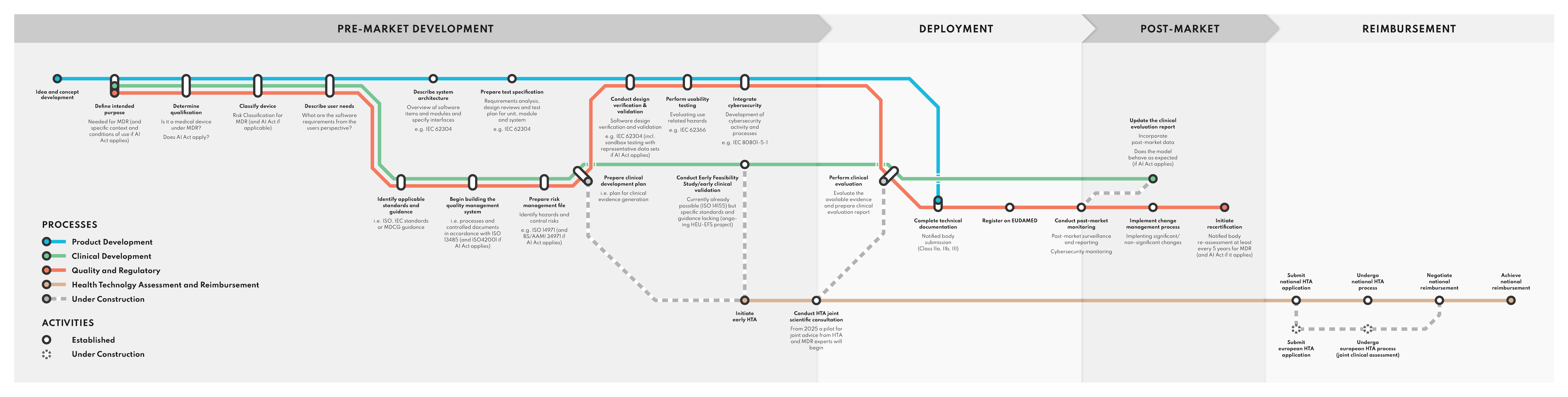 Für das Projekt HARMONISED APPROACH TO EARLY FEASIBILITY STUDIES FOR MEDICAL DEVICES IN THE EUROPEAN UNION (HEU-EFS), das am Institut für Digitale Medizin der Universität Marburg angesiedelt ist, wurde ein Ablaufplan entwickelt. Dieser ist im Stil eines U-Bahn-Netzplans gestaltet und dient dazu, die Richtlinien und Abläufe für die Durchführung von Early Feasibility Studies (EFS) anschaulich darzustellen.